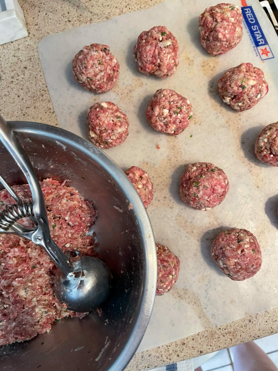 - Use a large ice cream scoop to portion the meat into meatballs, about 1/4 cup scoops. Roll the meat gently into a ball and set off to the side on a large baking sheet until all the meatballs have been formed.