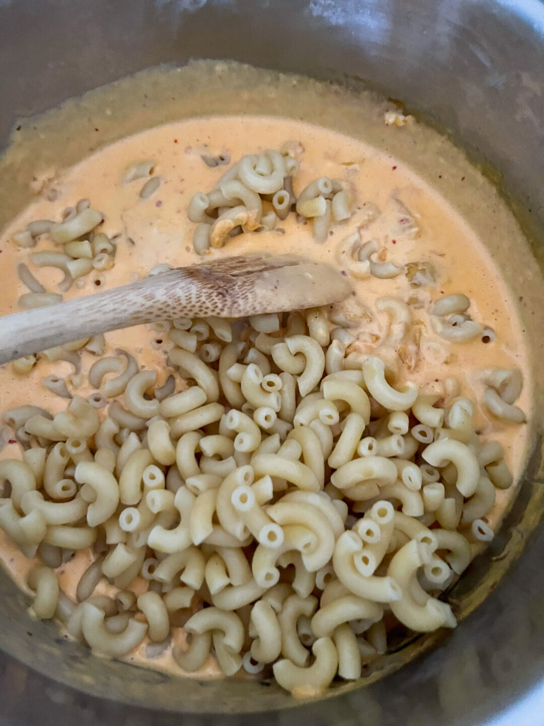 - Once the cheese melts into the roux and cream sauce, add the noodles and reduce to low.