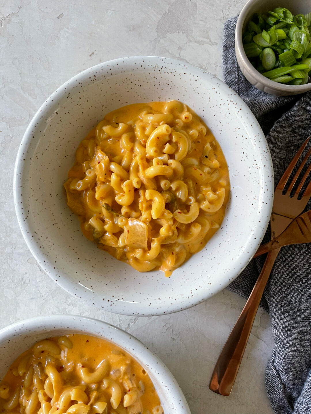 Kimchi mac and cheese has lots of cheesy umami flavor. Kimchi cooked in butter and then worked into a cheesy sauce. Fold in macaroni and top with green onions. A few ingredients that come together to pack a punch.