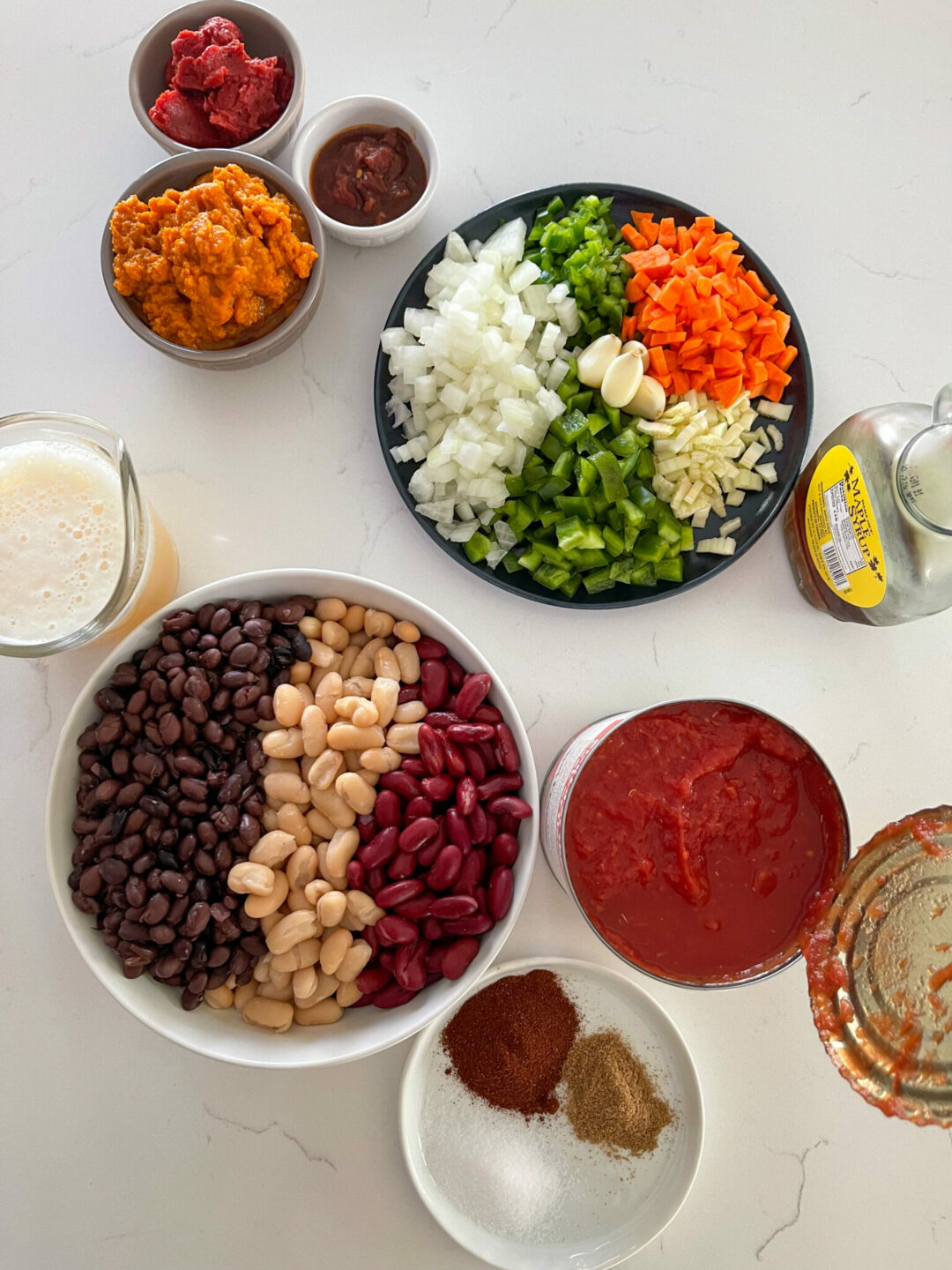 Three beans and lots of veggies cooked in a tomato, maple, chipotle, and pumpkin base.