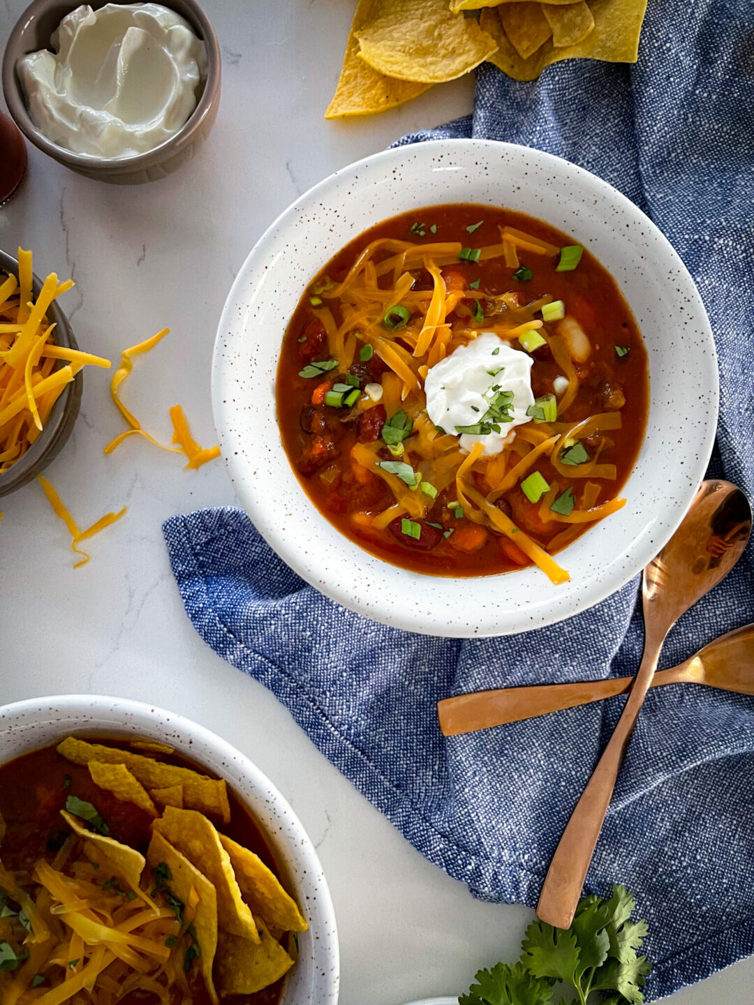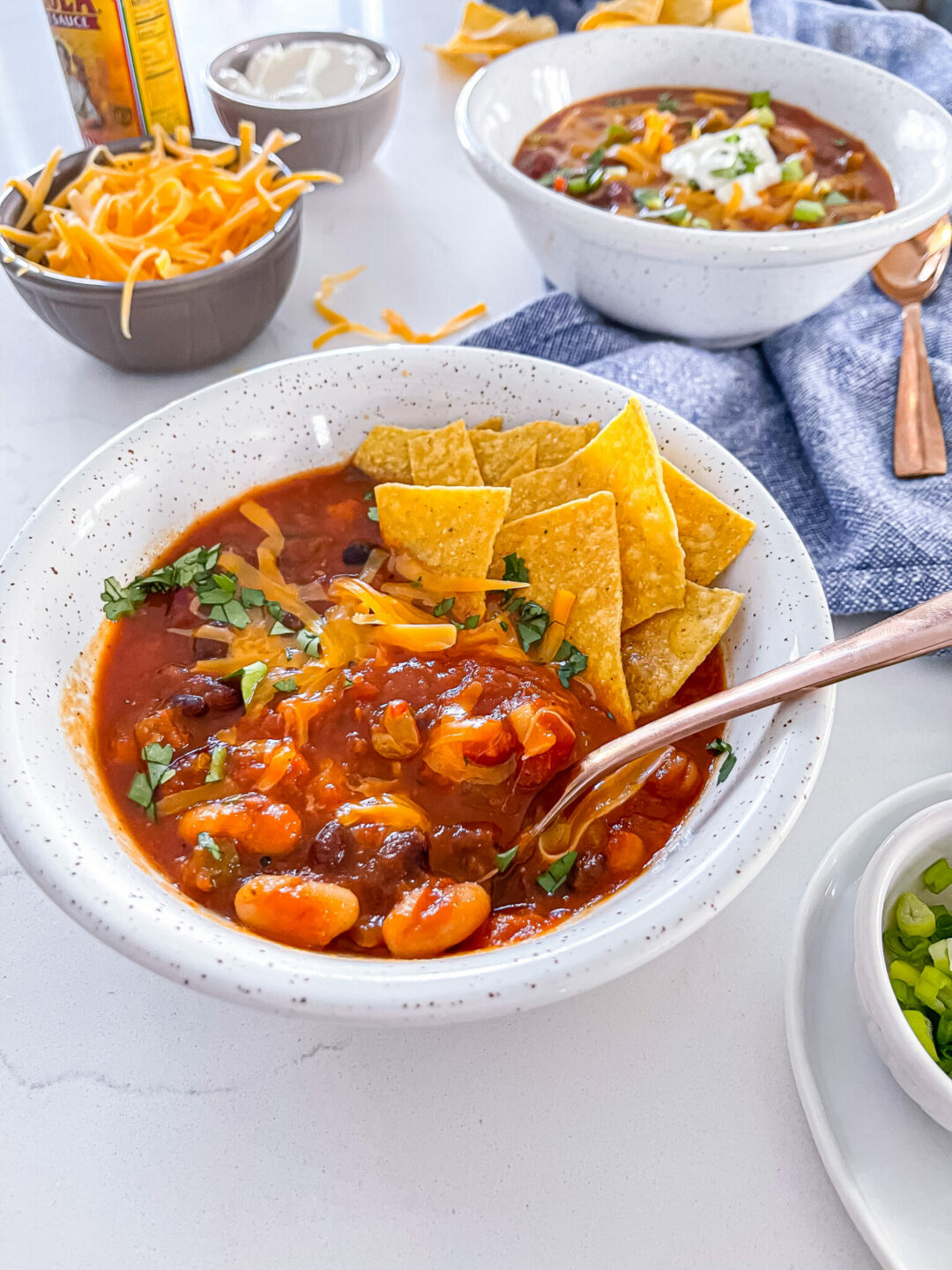 Three bean chili is a vegetarian dream. It has so many good veggies inside the sweet and spicy chipotle pumpkin tomato sauce.