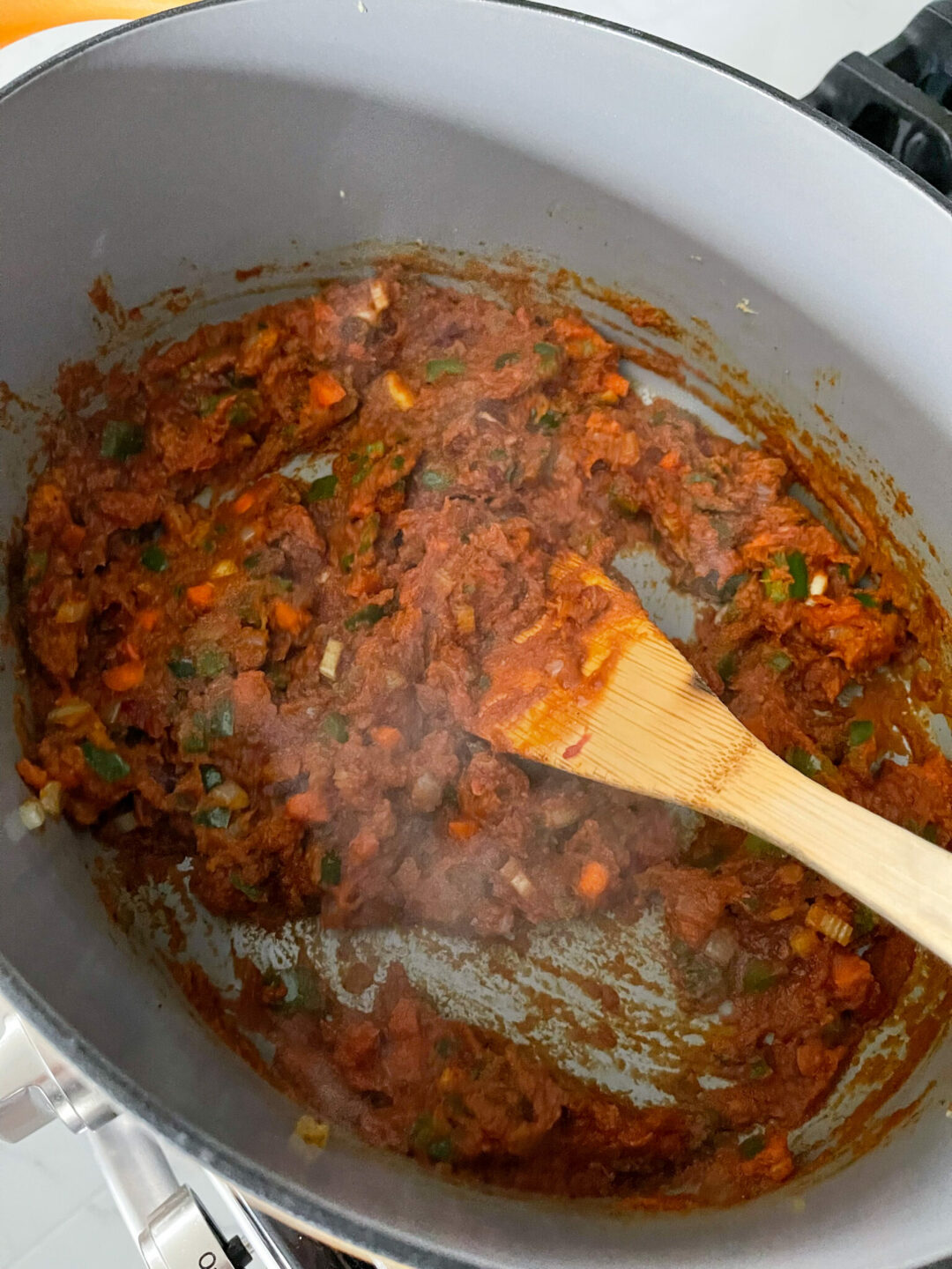 - Once the oil is shimmering add the onion, carrot, celery, jalapeño, bell pepper. Sautee for about 5-7 minutes until the onion is translucent and the peppers are tender.