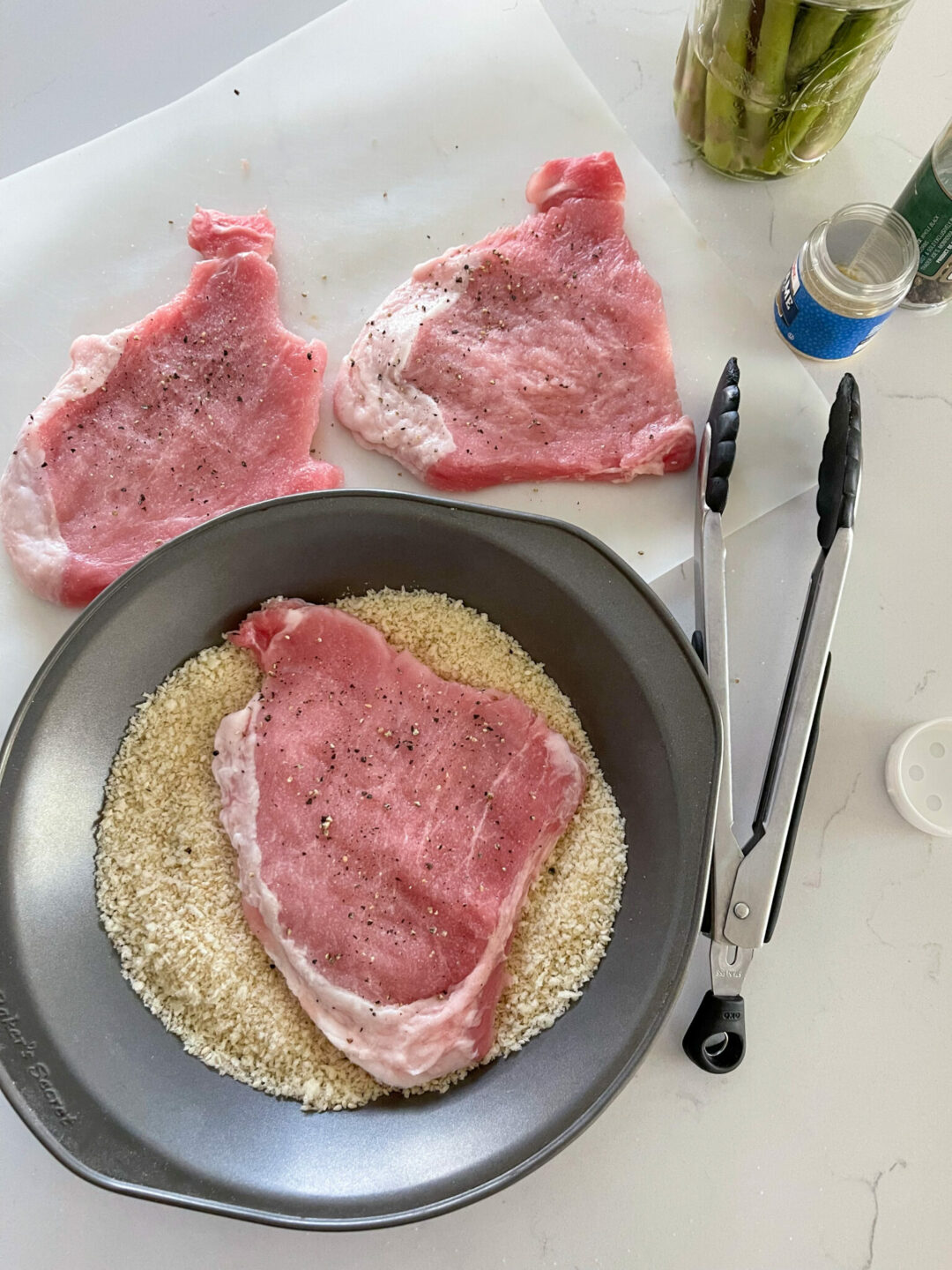 The pork chops are then pressed into a dish containing the panko and sesame seeds.