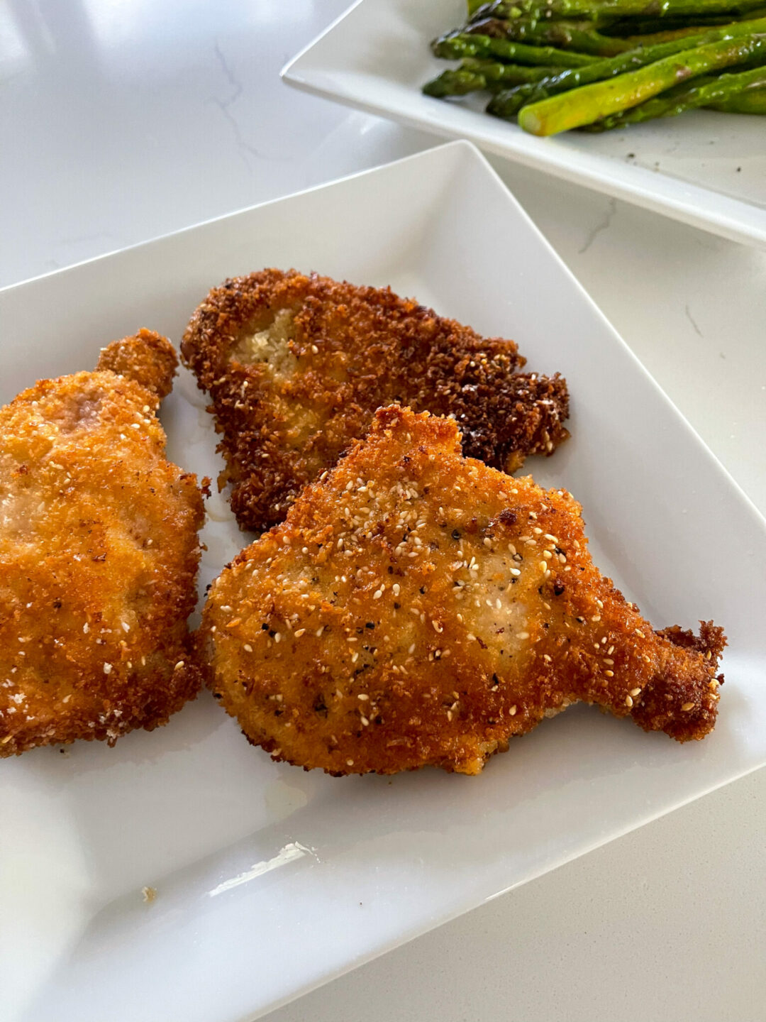 Pan fried panko pork chops are very easy and similar to a traditional German schnitzel. Boneless pork chops pounded super thin and crusted with a mix of panko bread crumbs and sesame seeds.