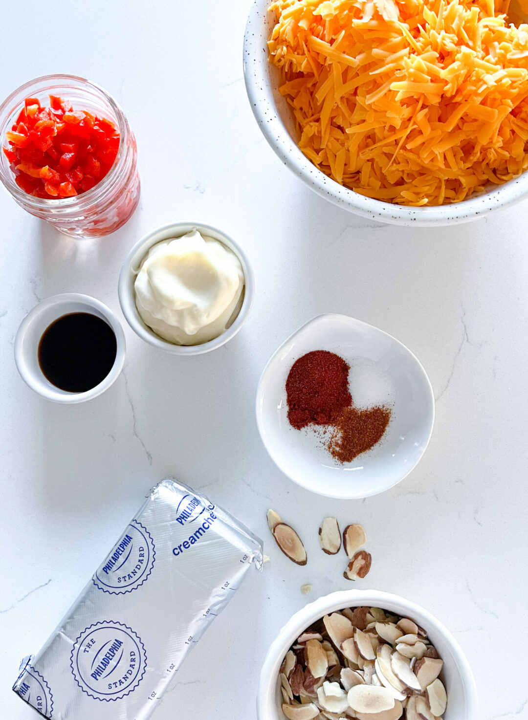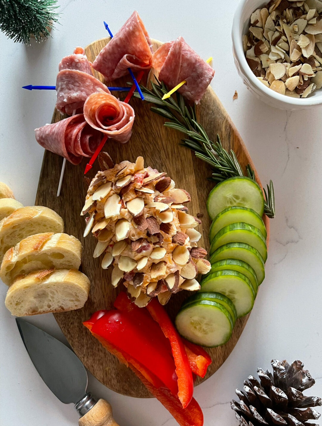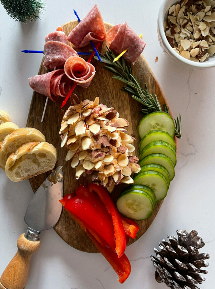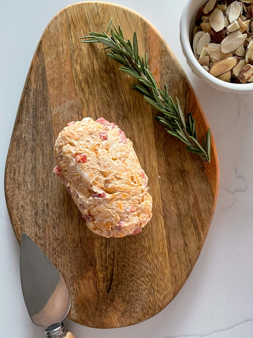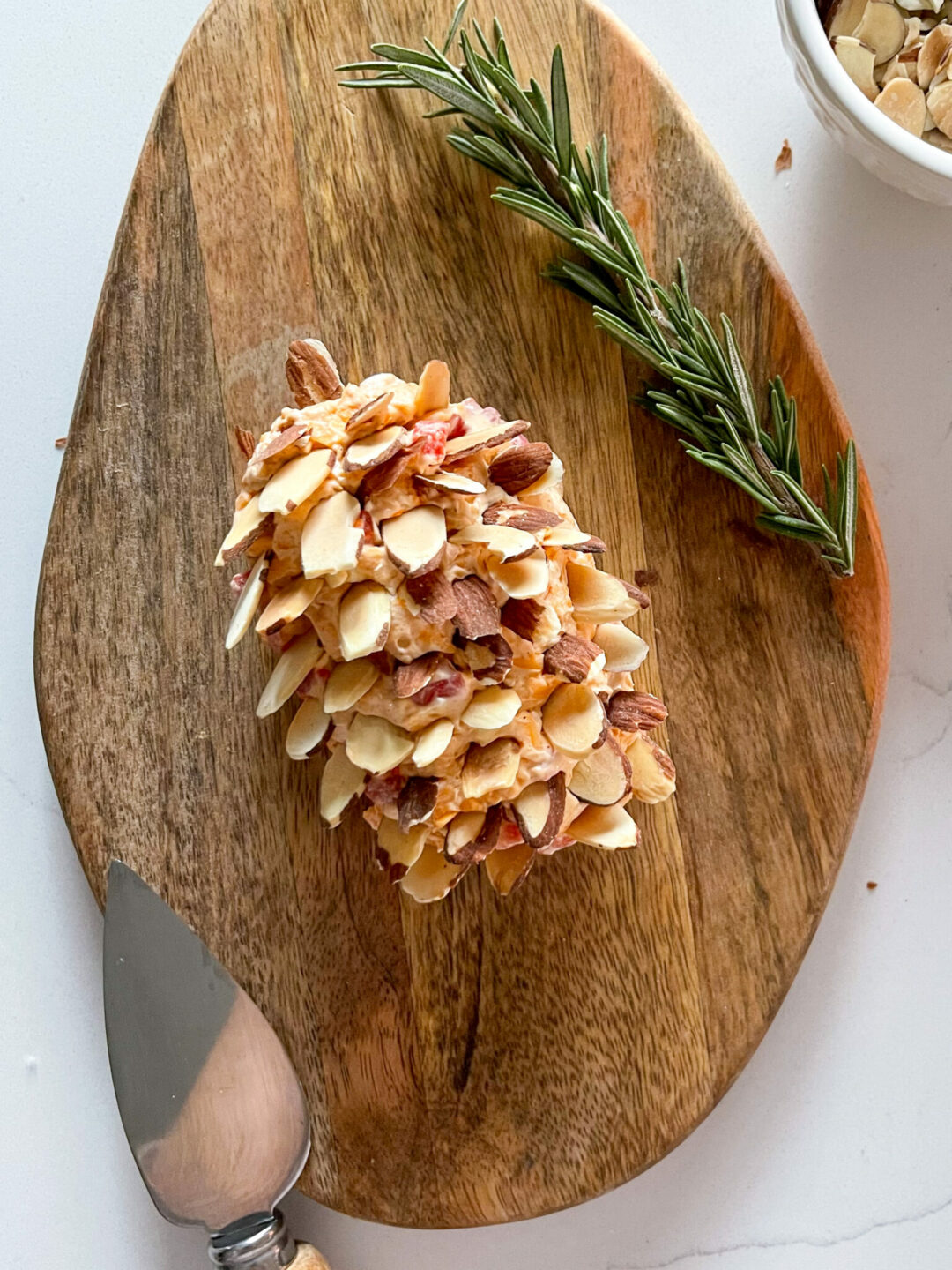 A cream cheese based pimento cheese studded with slivered almonds and formed into a fun and festive pinecone.