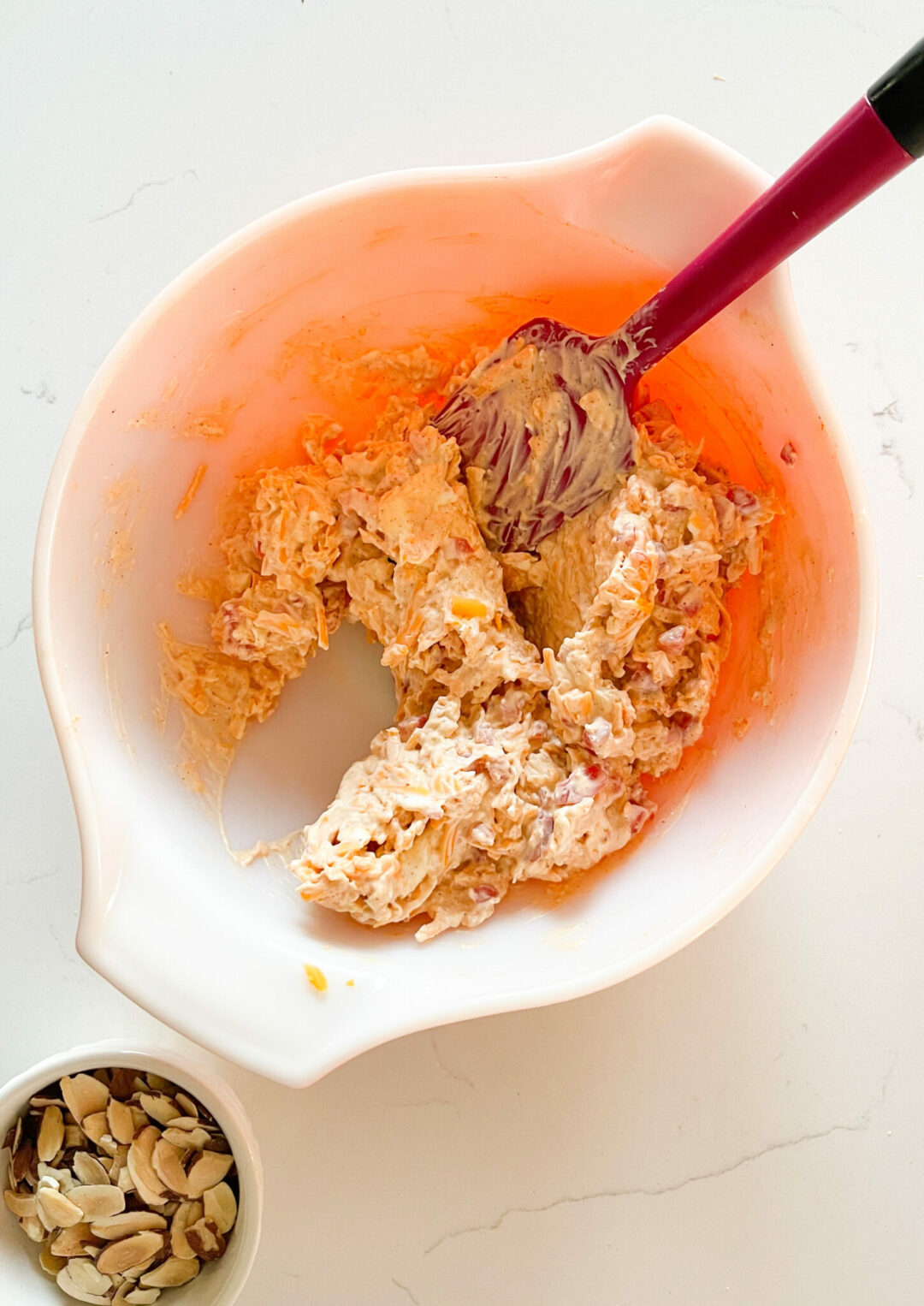 Combine all the pimento cheese ingredients in a bowl and use a spatula to mix it all together.