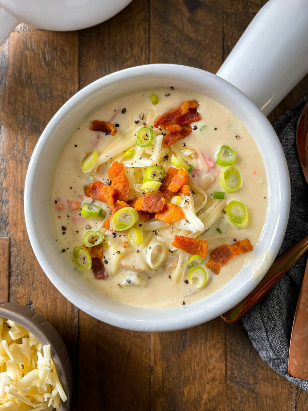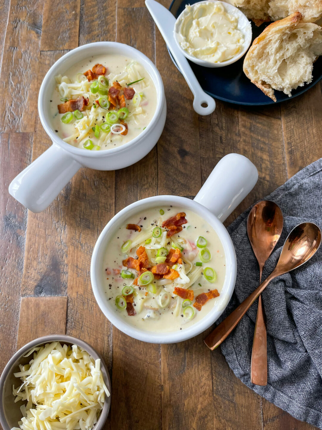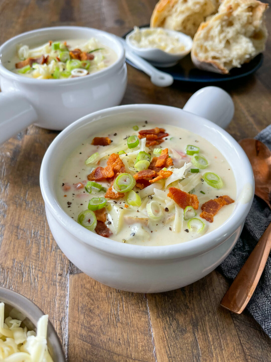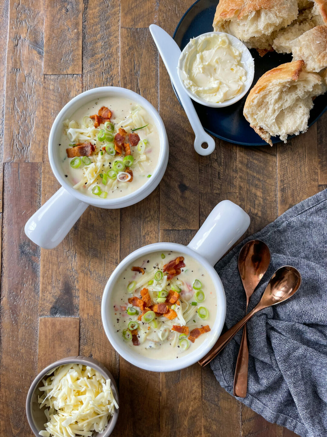 - Remove from heat. Adjust the salt to taste. Allow the soup cool for 5-8 minutes until transferring to serving bowls. Top each bowl with shredded cheese, bacon, and green onions. Season each bowl with black pepper.