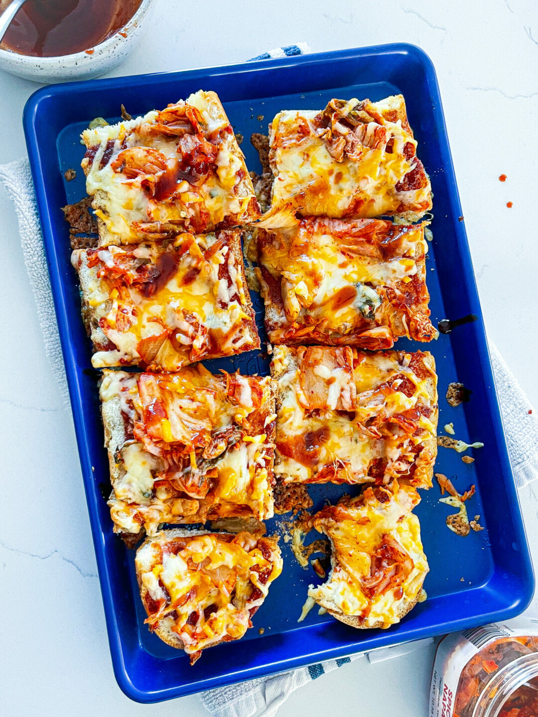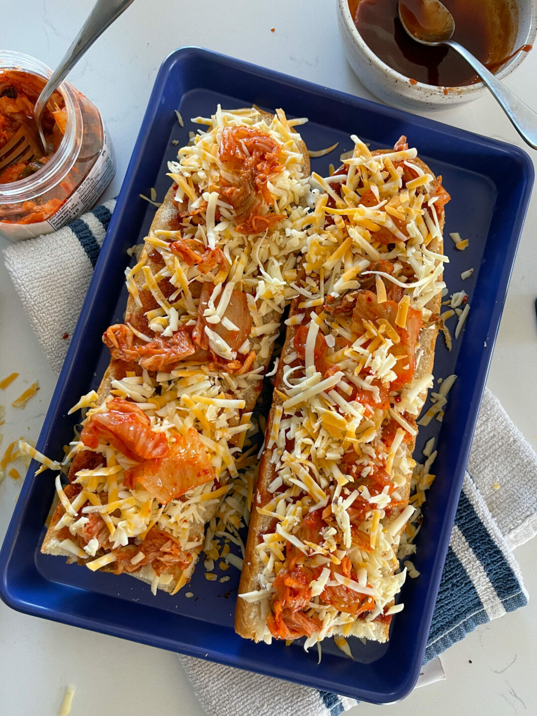 - Top the bread with pieces of kimchi and then cover with equal amounts of the cheeses. Add more kimchi on top of the cheese and the drizzle of the BBQ sauce.