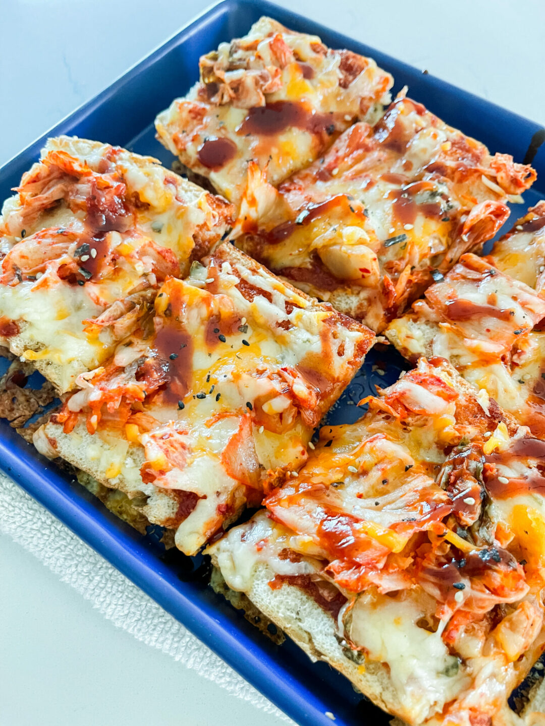 A spicy Gochujang BBQ sauce French bread pizza topped with kimchi, pepper jack, and colby jack cheeses.