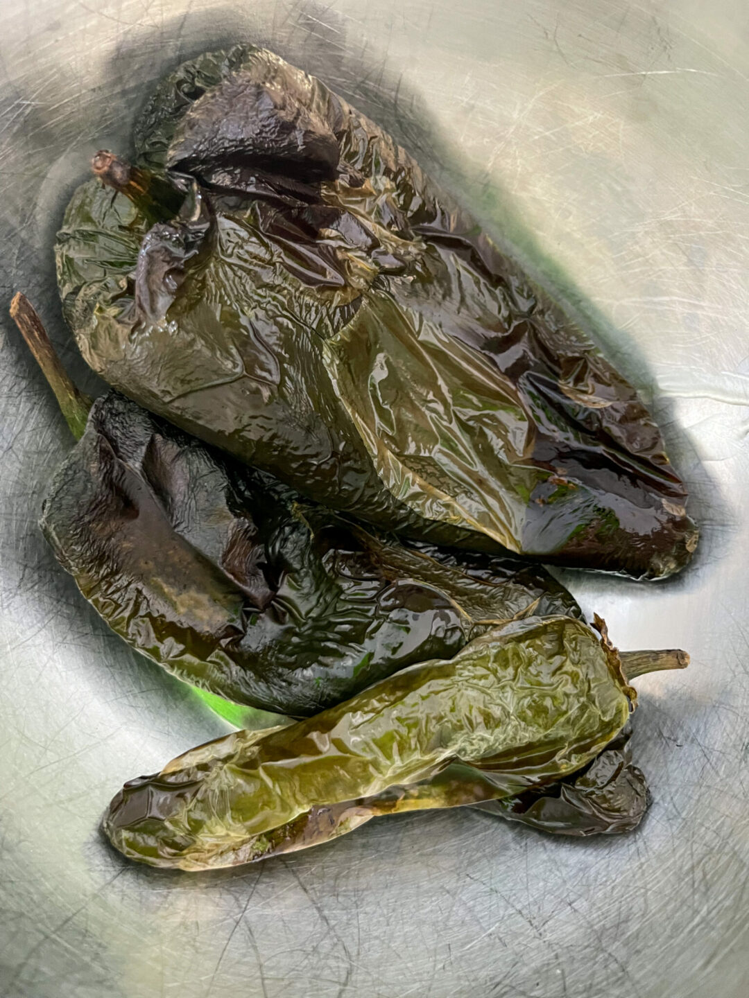 Once the skin of the peppers is evenly charred, place them into a bowl.