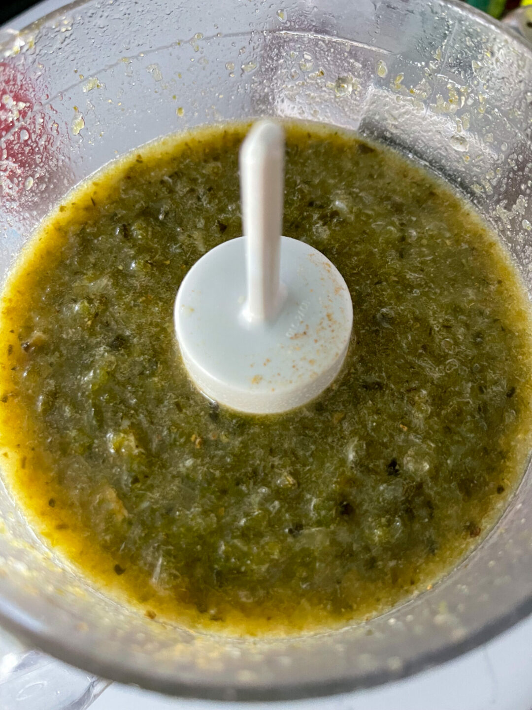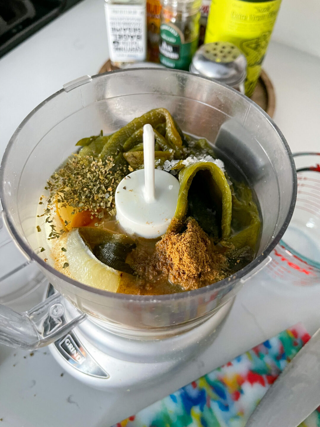 - Give the peppers, onion, and garlic a rough chop and then add to a food processor. Add in the salt, cumin, and oregano. Pulse until finely minced. Add 1/4-1/2 cup of water to the food processor and puree until smooth or a thin salsa consistency.