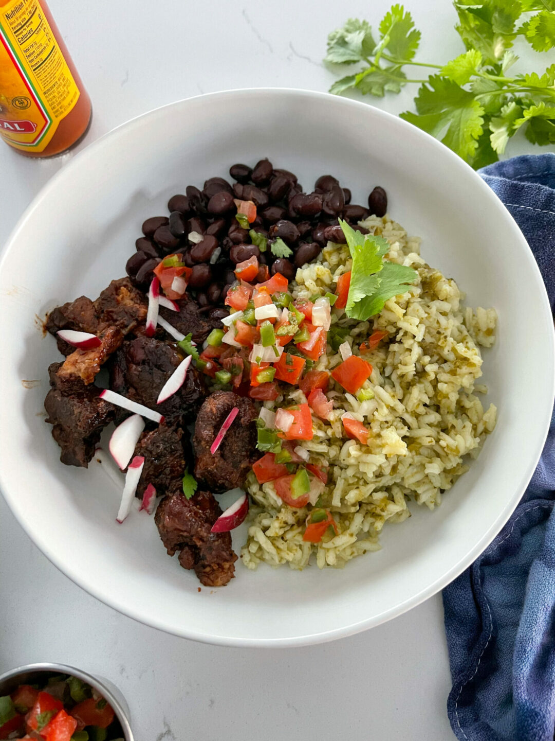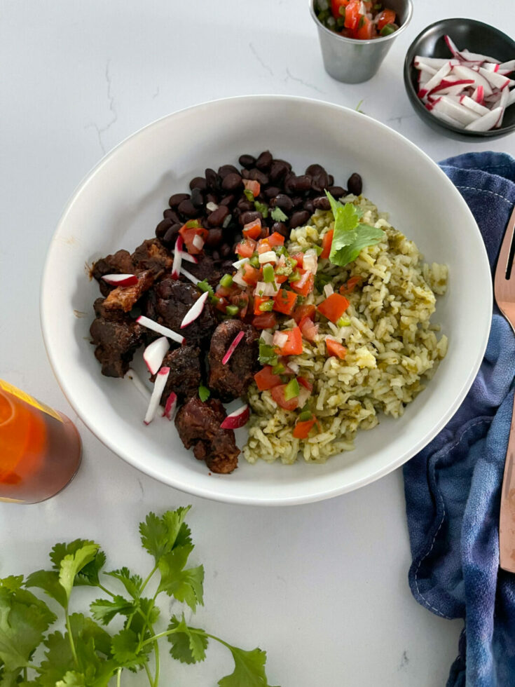 Long grain white rice cooked in a roasted poblano, jalapeño, onion, and garlic puree to make it green Mexican rice.