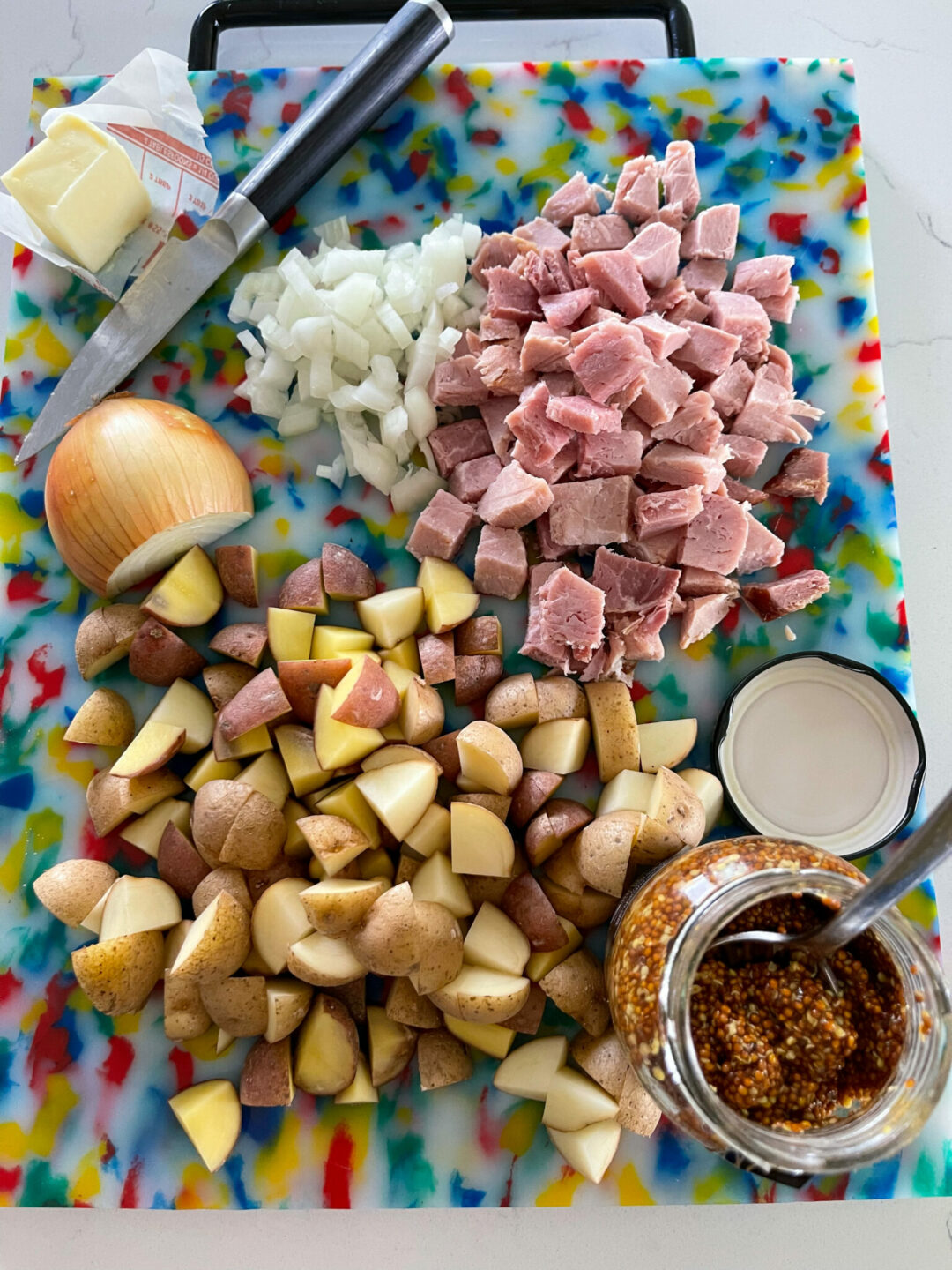 - Remove the lid. Add the ham, onion, and butter. Mix until butter melts and combines. Cook until the ham starts to caramelize. When the potatoes are cooked through and tender, mix in the mustard.