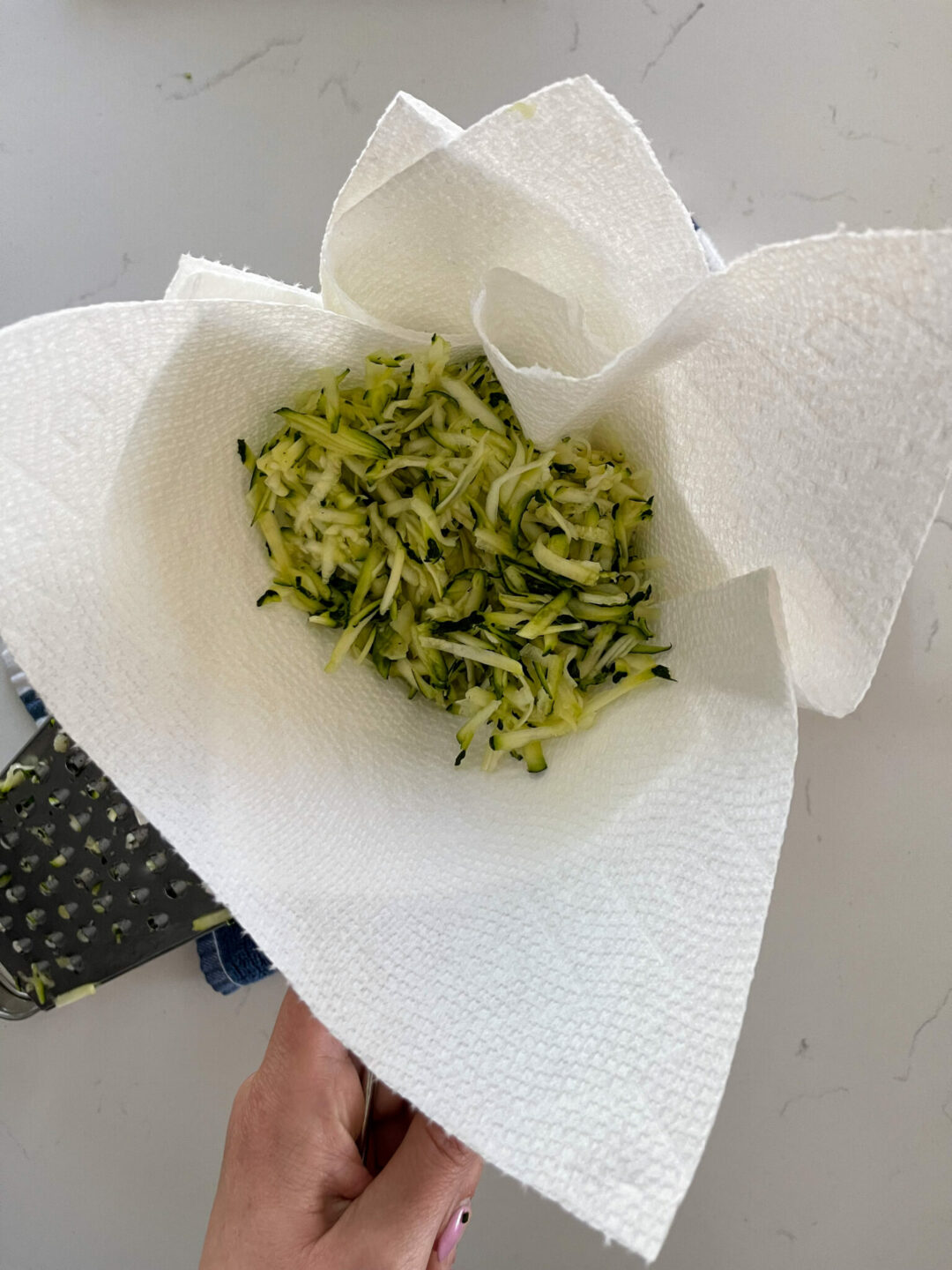 - Grate the zucchini and add to a paper towel or kitchen towel lined strainer. Gently press down to start the draining process. Let sit in the fridge until the noodles are cooked.