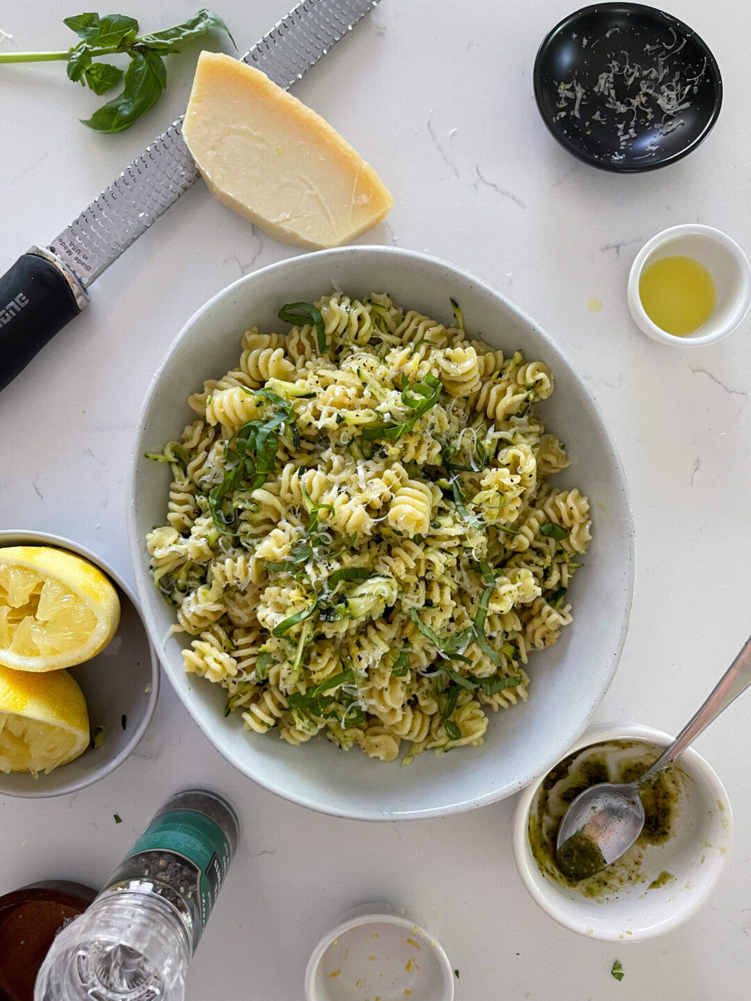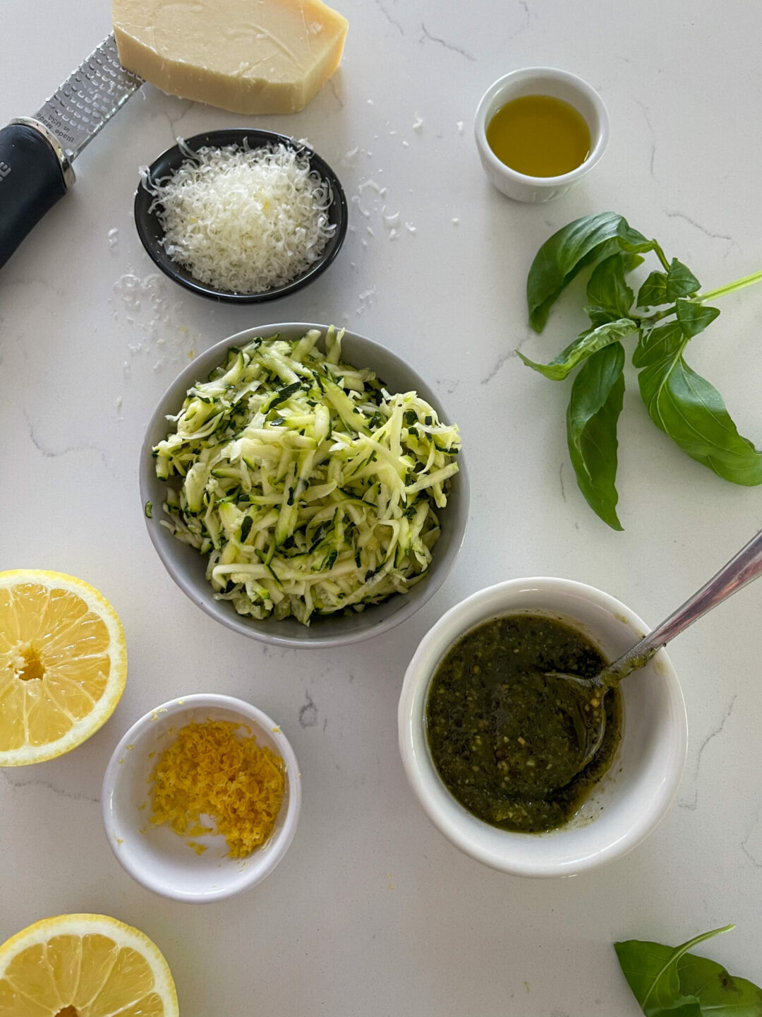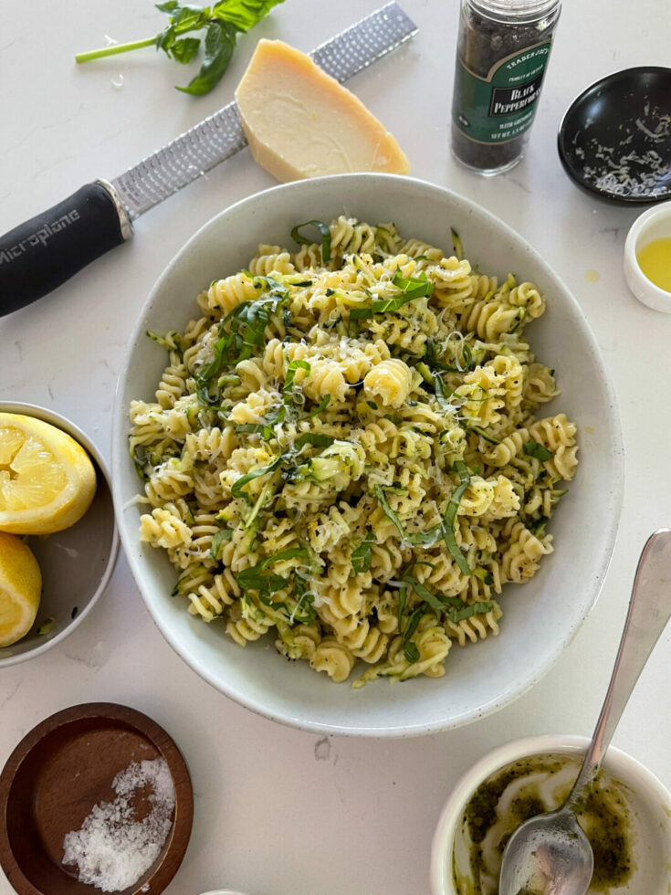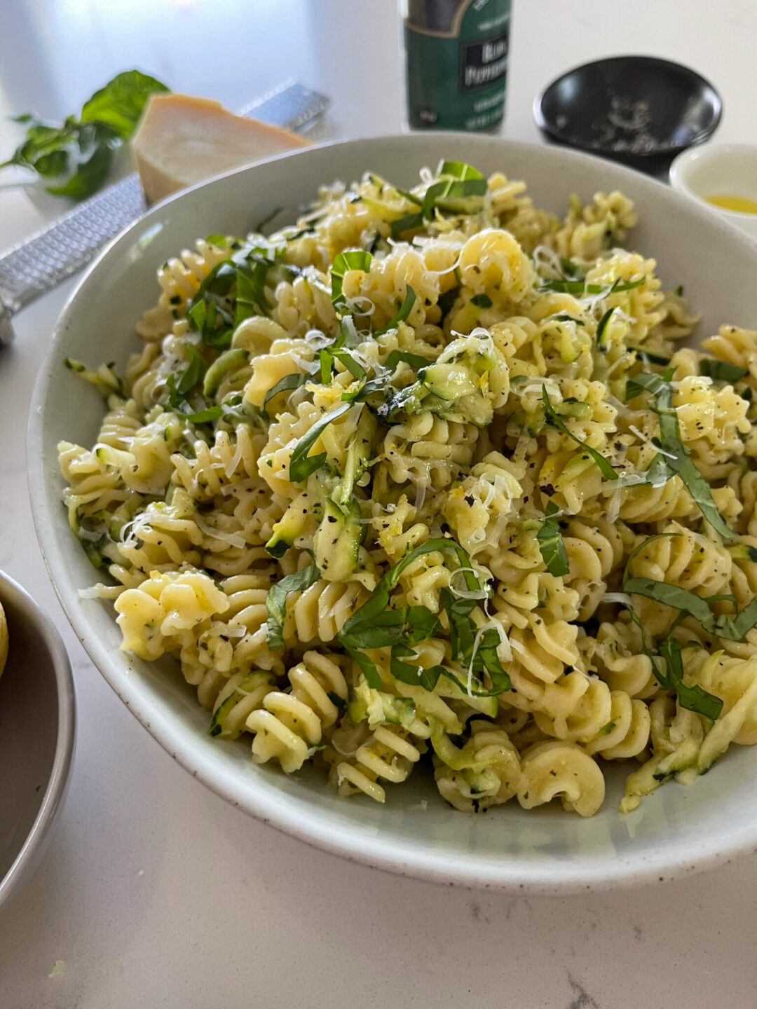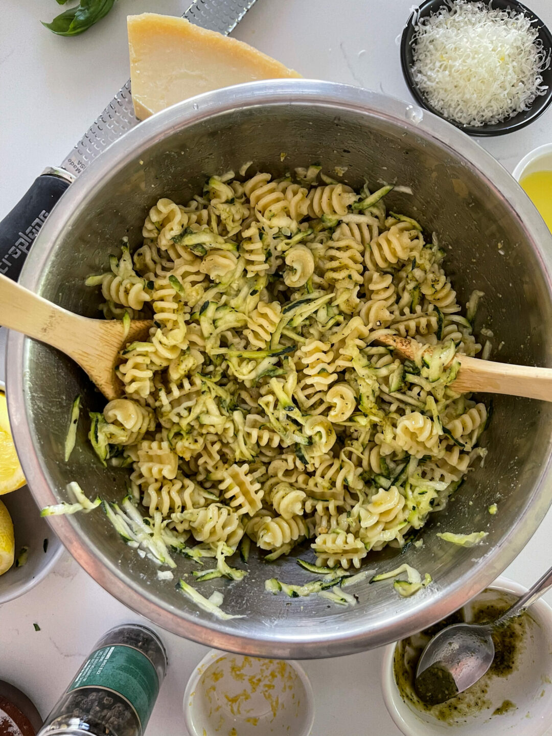Freshly grated zucchini mixed with radiatore noodles, pesto, lemon juice, lemon zest, olive oil, salt, pepper, grated parmesan, and fresh basil.
