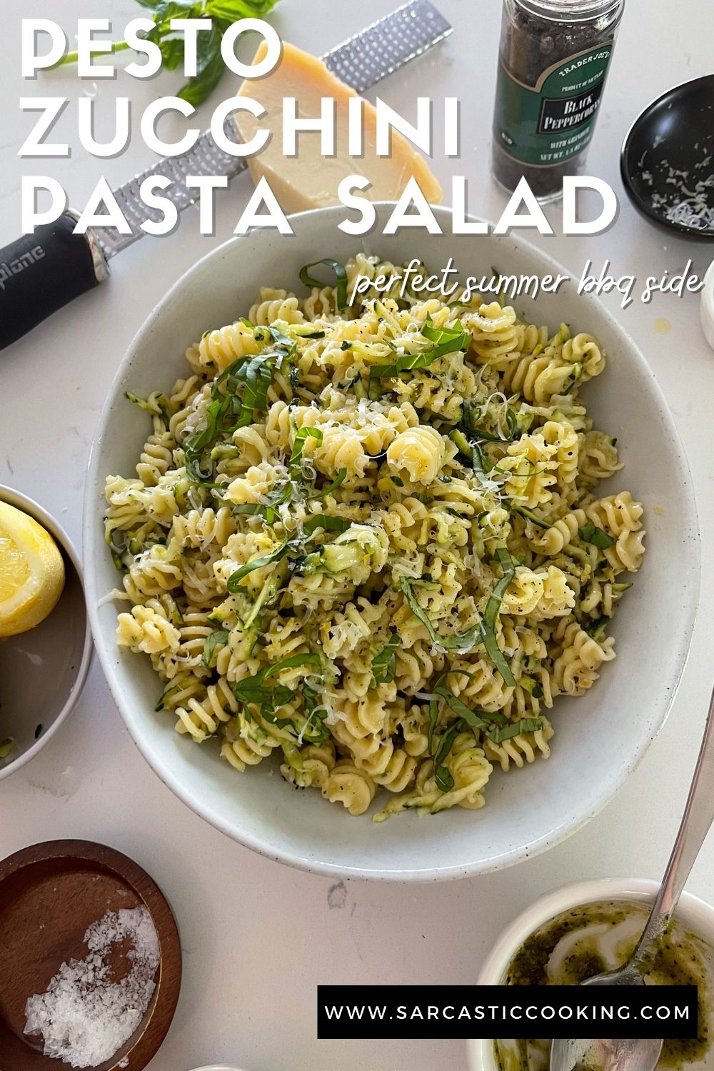Pesto zucchini pasta salad has minimal ingredients and a lot of fresh, crisp flavors. Fresh zucchini mixed with a little pesto, lemon juice, and noodles.