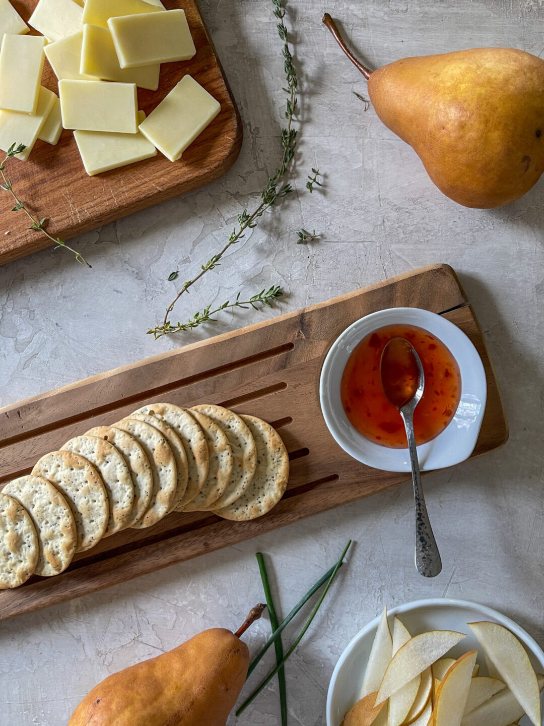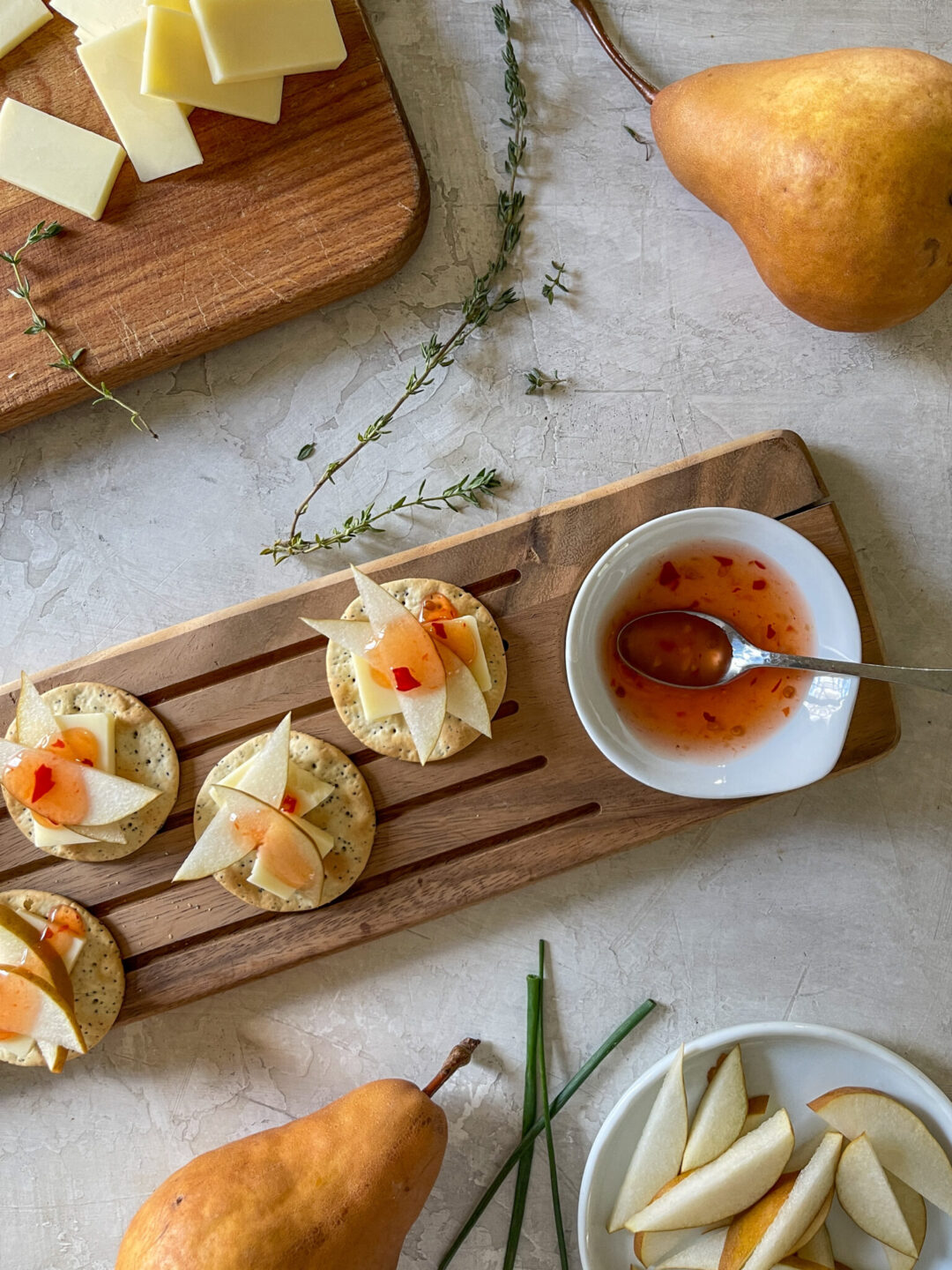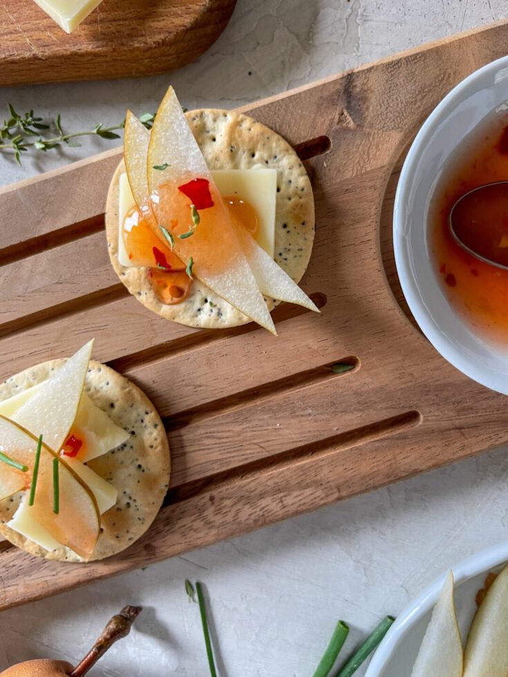 Crackers topped with sharp cheddar, Bosc pear, and sweet chili sauce.