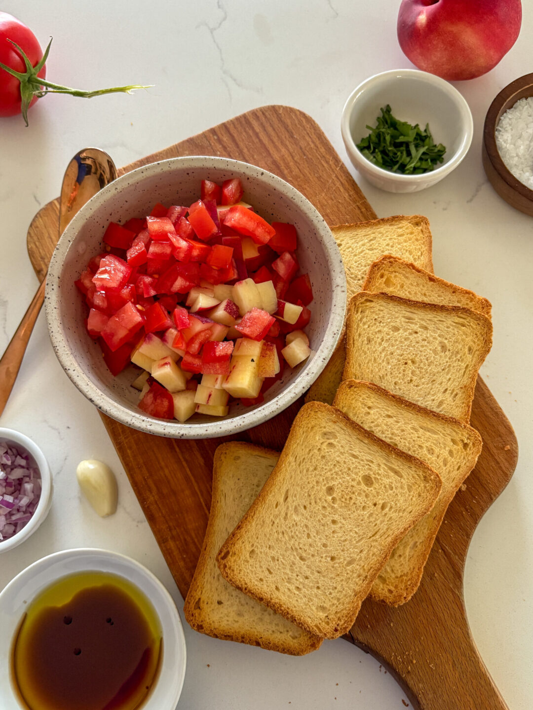 Dealer’s choice here when it comes to onions. Traditional bruschetta uses shallots. I say it’s ok to use red onion or yellow onion in a pinch.