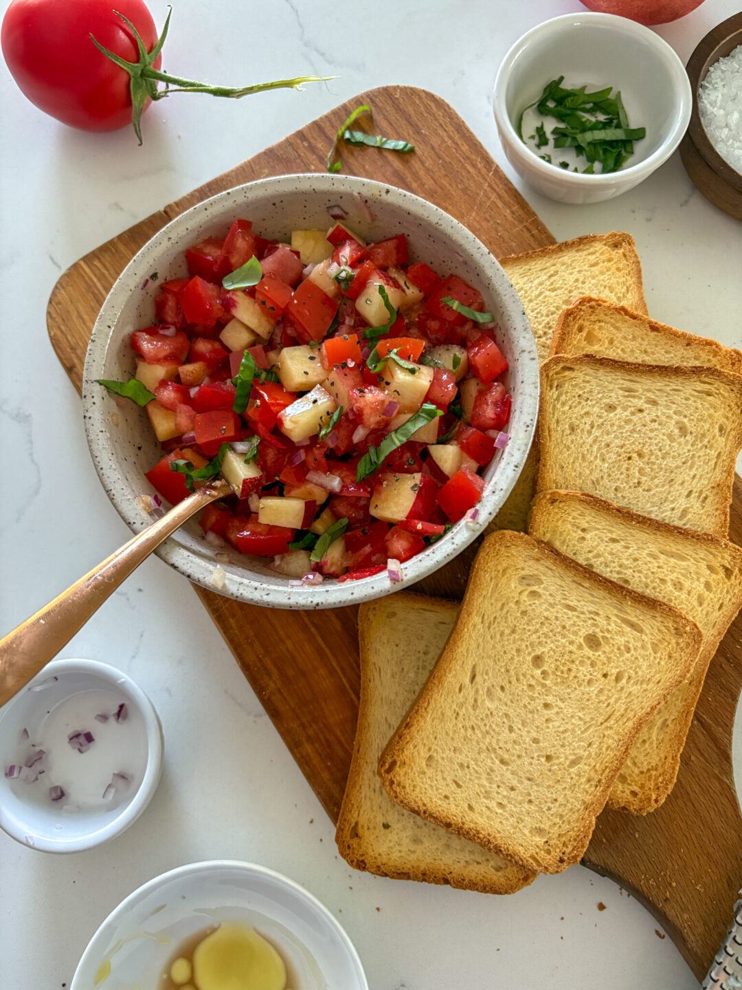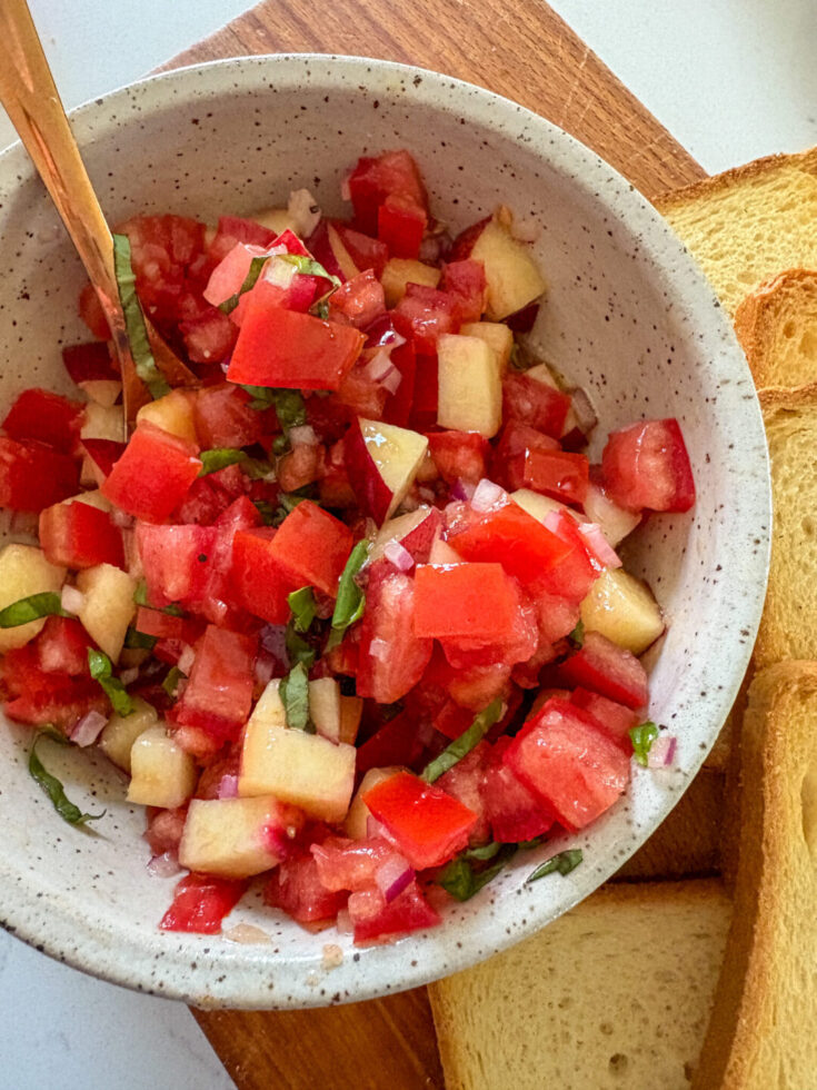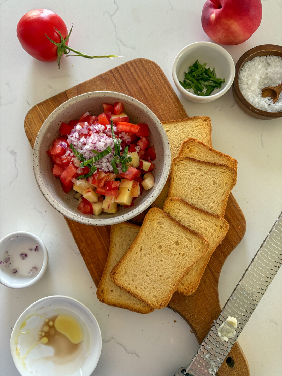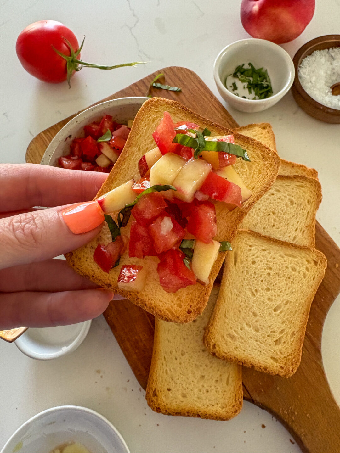 My favorite way to eat nectarine and tomato bruschetta is over sliced, toasted baguette.